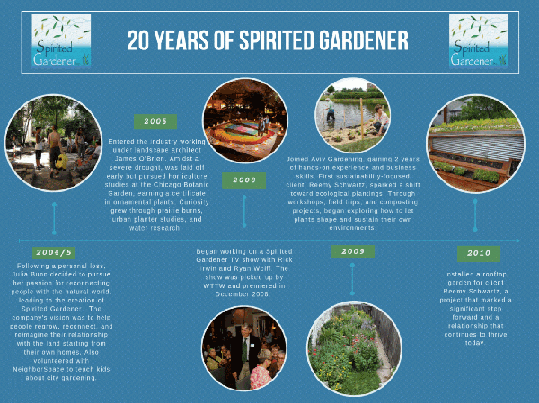 To celebrate, we’ve dug through the archives to create a timeline that captures the story of Spirited Gardener. It marks our growth, our favorite memories, and the key moments that have shaped us. Follow the link here to see the timeline!