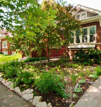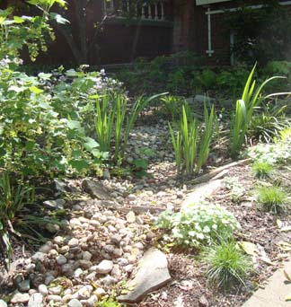 We created a rain garden large enough to manage rain water coming off of 1,000 sq. ft. of roof surface with two downspouts. Puddling and ponding on the public walkway was successfully managed by creating an attractive dry stream bed.