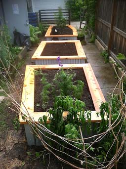 Raised beds made with galvaluminum siding and filled with organic vegetable soil were built in 2015 to replace the original repurposed barn wood beds that had begun to rot.