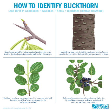 - The Problem: Buckthorn is a woody invasive that was brought over by Europeans as a popular hedge plant. It quickly takes over areas, as it leaves out extremely early and retains leaves late into the fall, depriving native plants of essential sunlight and resources. Its dense growth also alters soil conditions, hindering native plant survival. It's easy to spot in winter by its dark bark, thorns, and lingering black berries.